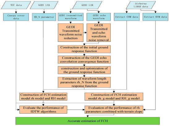 Since the release of the GEDI L2A product datasets, studies on FCH estimation based on GEDI echo waveforms have primarily used the waveform length parameter RH_N provided by these datasets as a model factor, overlooking the underlying data processing of GEDI echo waveforms. To address the unavoidable issues of waveform broadening and waveform overlap in waveform data processing, this study proposes an IDTW algorithm from the perspective of processing GEDI echo waveforms. The construction of the IDTW algorithm requires the use of the transmitted waveforms and echo waveforms from the GEDI L1B product datasets.