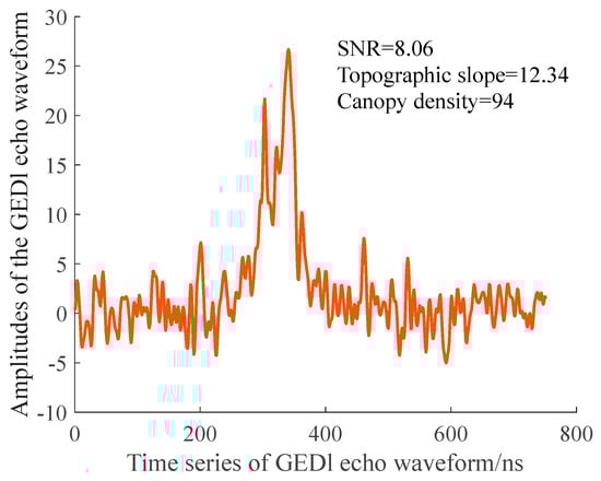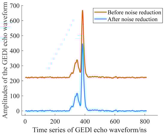 where is the noise-reduced GEDI echo waveform, and is the GEDI echo waveform before noise reduction. refers to the mean amplitude of the first 100 frames of the GEDI echo waveform before noise reduction. In Figure 5, the brown waveform and the blue waveform represent the GEDI echo waveforms before and after noise reduction, respectively.