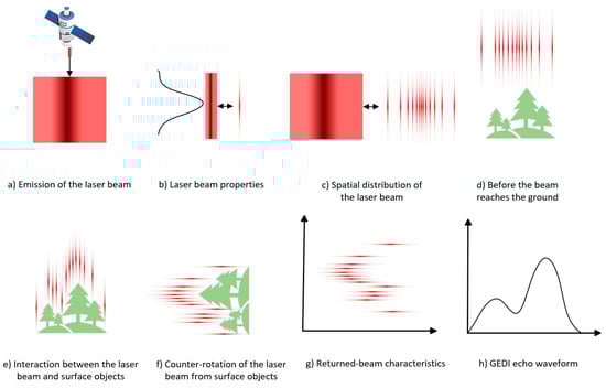 Figure 6e illustrates the interaction between a GEDI transmitted laser pulse and ground targets. The GEDI footprint projects onto a circular area with a diameter of approximately 25 m, covering a relatively large surface region. Within this footprint, considerable elevation differences exist, not only between different trees but also among the branches and leaves of the same tree. Consequently, part of the laser energy is reflected by canopy elements and returned to the receiver, while another portion penetrates through canopy gaps, reaches the ground, and is then reflected back. Due to the elevation differences between canopy and ground surfaces, the reflected signals from canopy and ground returns arrive at the receiver at different times.
