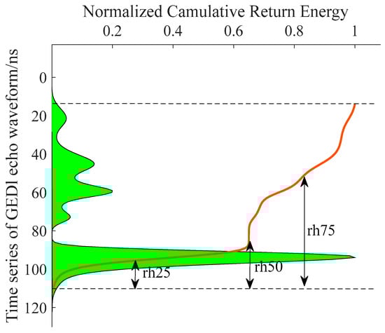 NASA’s official team defines the RH_N parameter as the vertical distance from the ground peak point to the point where the energy proportion within the effective echo waveform reaches N, with the end point of the effective echo waveform serving as the reference starting point. The effective echo waveform is defined as the segment of the GEDI echo waveform between its start and end points. It should be noted that RH_N represents the waveform length parameter of the GEDI echo signal.