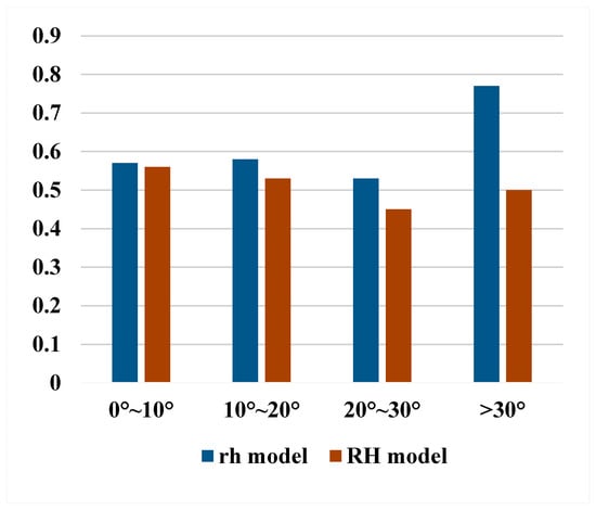 Figure 18 shows that, at the DSNY site, the FCH estimation accuracy—when using the rh model with full-power beams—was lower than that when using the RH model with the same beams. An analysis of the box plots of the terrain slopes for different sites with full-power beams (see Figure 19) revealed that the mean terrain slope at the DSNY site was lower than that of other sites, and its slope distribution was more concentrated. This scenario reduced waveform broadening and waveform overlap caused by NHWTLP. Therefore, the constant term parameter in the RH model can effectively mitigate waveform broadening and waveform overlap at sites with concentrated terrain slope distributions—ultimately resulting in lower FCH estimation accuracy for the rh model compared to the RH model at the DSNY site.