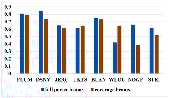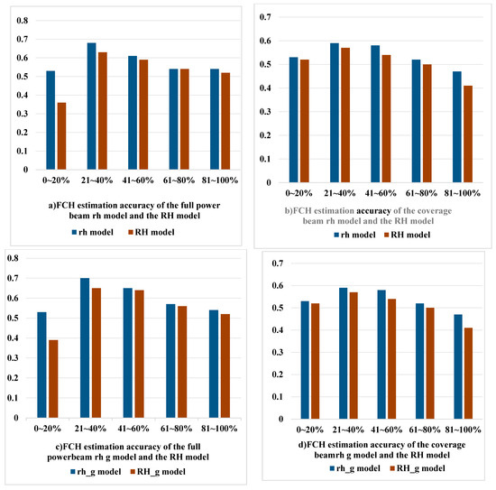 Bar chart of FCH estimation accuracy for GEDI full-power beams and coverage beams with rh model.