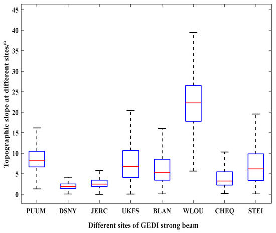 Box plot of GEDI full-power beams at different sites and terrain slopes.