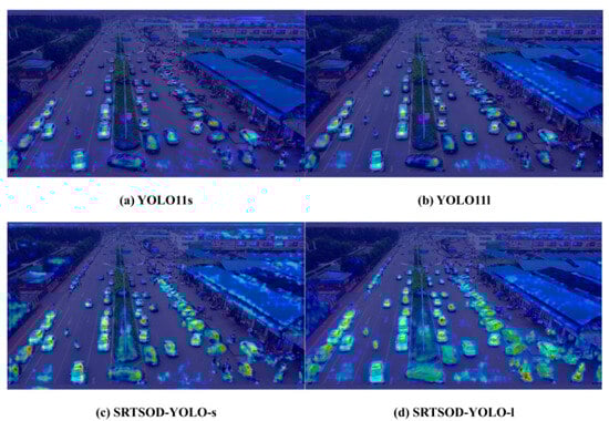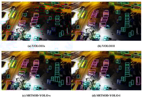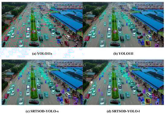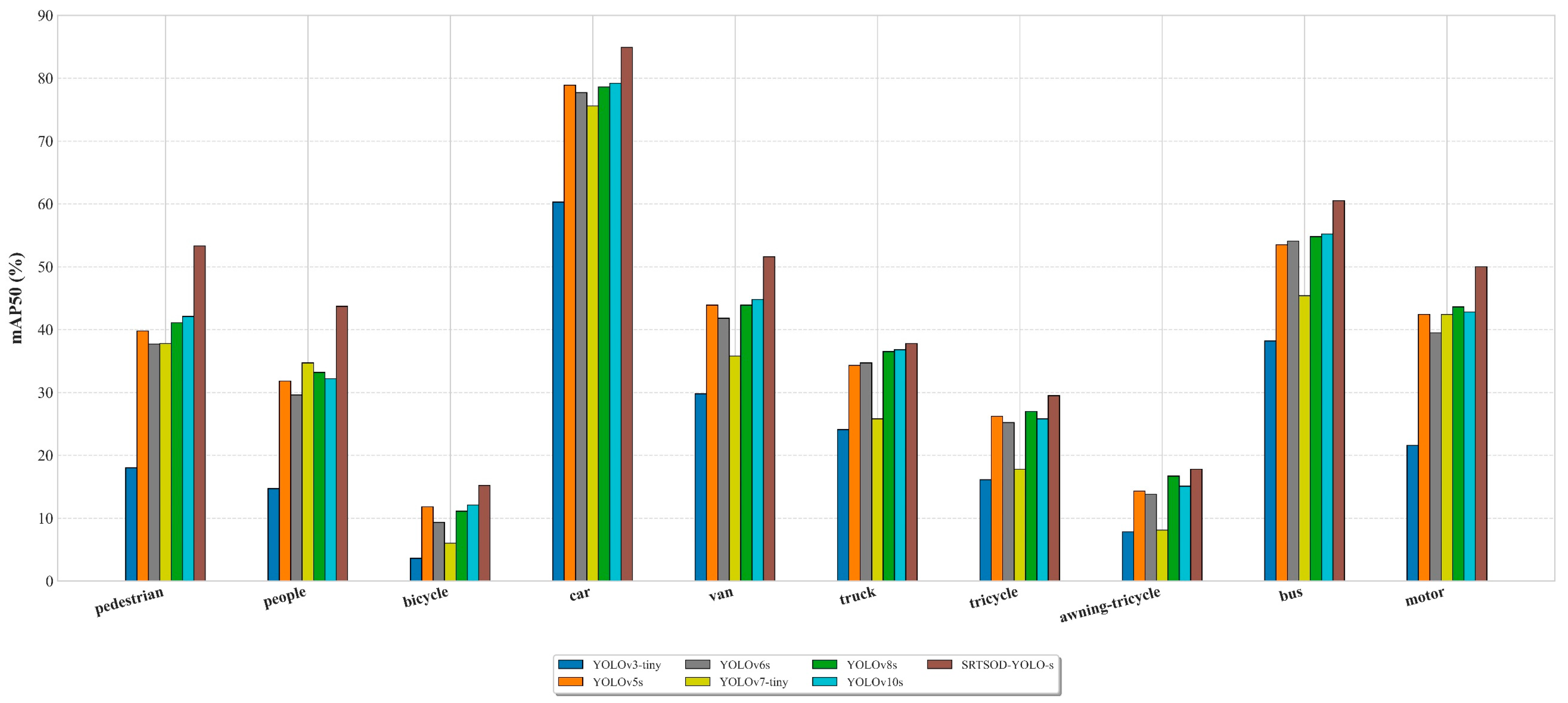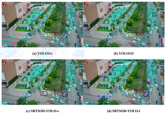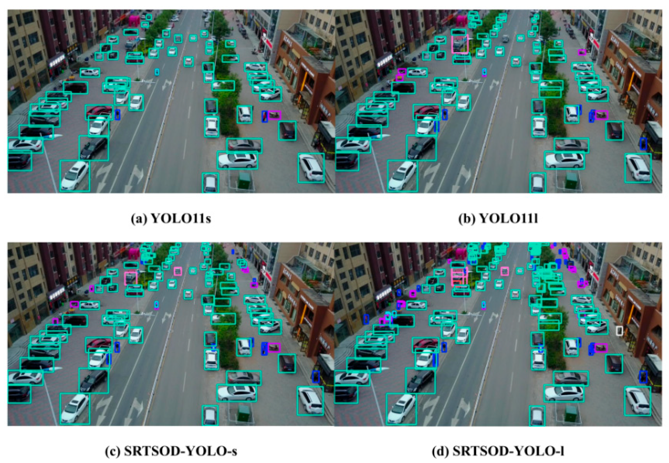 - The proposed SRTSOD-YOLO series models significantly improve the detection accuracy of small targets in UAV aerial images while maintaining real-time performance. Compared with YOLO11l on the VisDrone2019 dataset, SRTSOD-YOLO-l achieves a 7.9% increase in mAP50 and a 1.08% reduction in missed target metric Emissed.