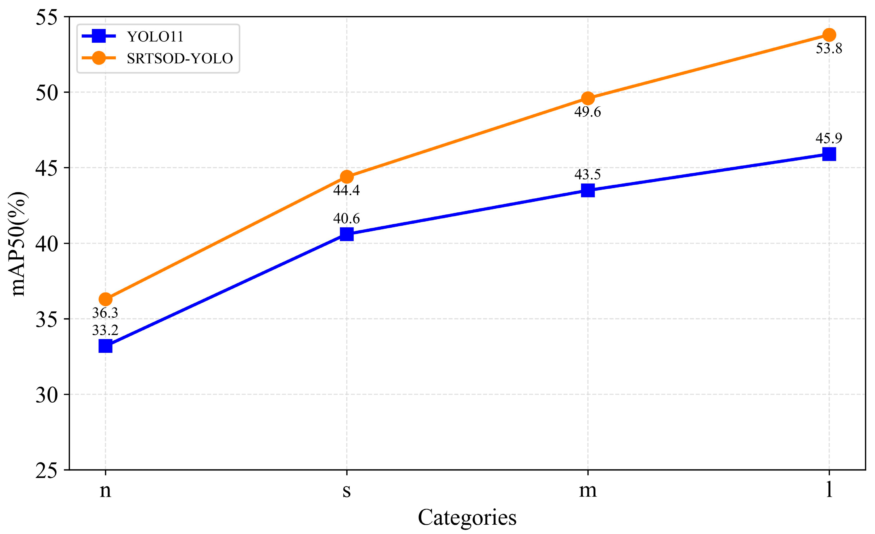 SRTSOD-YOLO-s | 44.4 | 27.0 | 11.1 | 24.2 | 138 | MFCAM + GACFPN + ATFL |