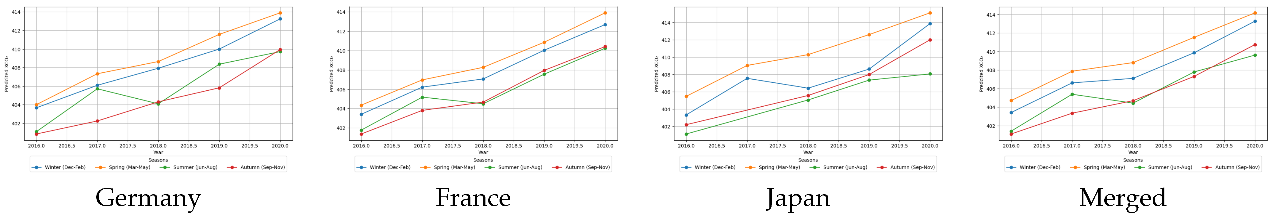 Proposed Study | 1 ; monthly, seasonal, and yearly | Germany, France, and Japan | Generalized Stacked Ensemble Model | Monthly RMSE: 1.42 MAE: 0.84 : 0.90 | TCCON, CAMS , and NDVI |