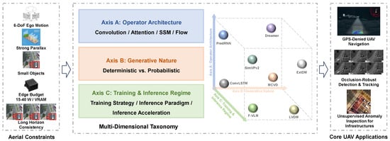 The landscape of video prediction models is heterogeneous and evolving at a breakneck pace. While several excellent surveys exist, they often categorize models along a single axis, such as “RNN-based vs. CNN-based” or “deterministic vs. generative” [19,20,21]. Furthermore, broader reviews on video generation often focus on creative applications rather than robotic control [22]. Such taxonomies, while historically useful, struggle to properly position the latest hybrid architectures and, more critically, fail to provide a clear framework for understanding the role of emerging temporal operators. In particular, state-space models (SSMs) defy simple classification: their inference process is recurrent, yet their training can be parallelized like a convolution, and they capture long-range dependencies akin to transformers [23,24]. Similarly, the proliferation of attention variants (e.g., sparse, low-rank, local) has blurred the lines, offering different inductive biases and scalability trade-offs compared to traditional convolutional recurrence [25,26]. For a practitioner aiming to deploy a model on a resource-constrained UAV, a taxonomy that explicitly disentangles the backbone topology from the choice of temporal operator is essential for navigating these design choices and their performance implications. This review aims to fill this gap.