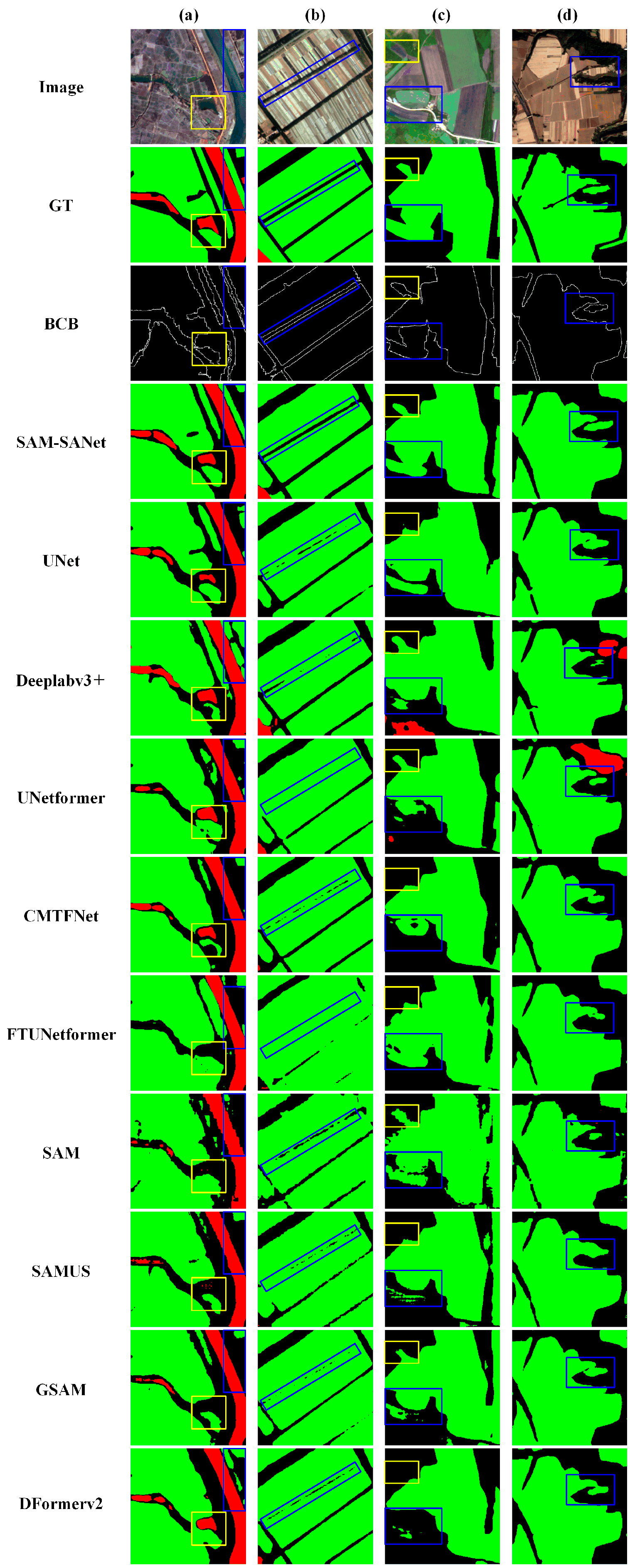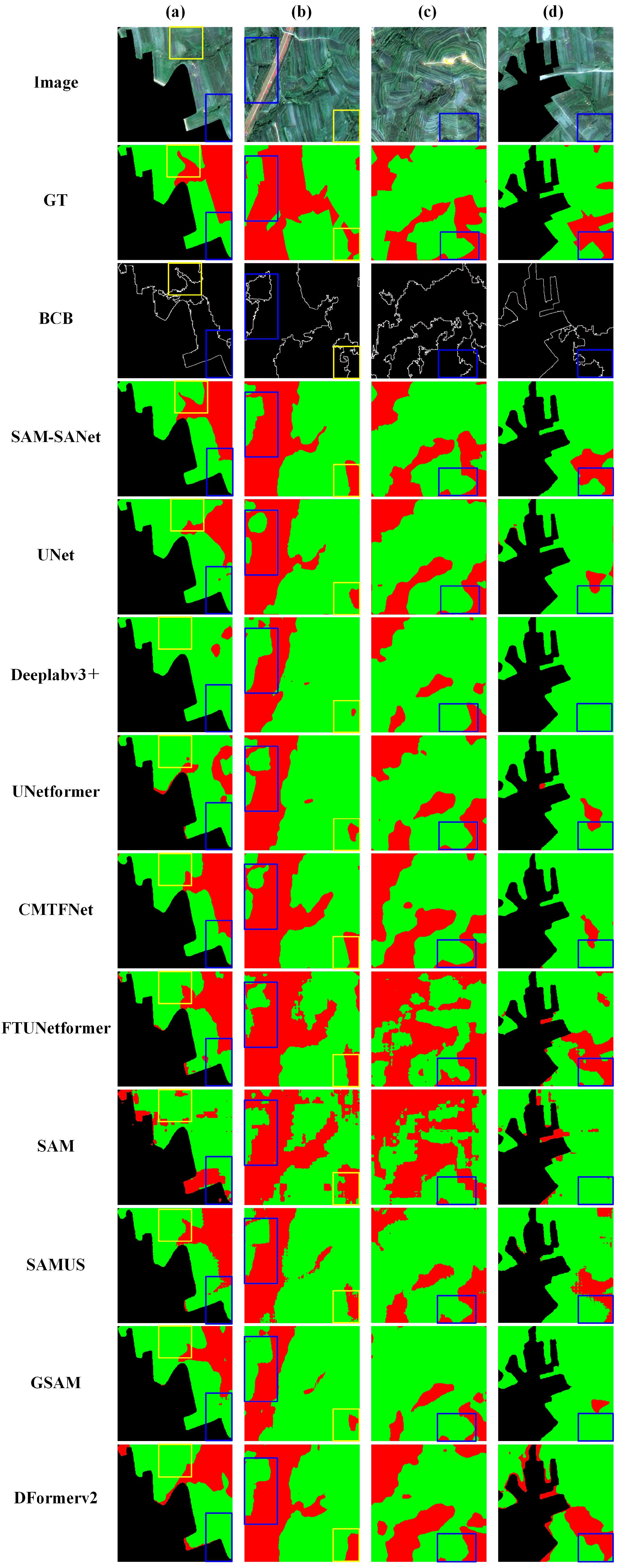 To verify the effectiveness of SAM-SANet, ablation experiments were conducted on the three datasets with the aim of assessing the specific impact of each module to the overall segmentation performance. The ablation mainly focused on the SAB, the SAM branch that perceives cropland boundaries (BCBSAM), and the BFFM and PGSM incorporated to enhance cropland boundary representation. For the BFFM and PGSM in particular, a more fine-grained ablation was performed. In addition to the cumulative ablation setting, the parameters of either BFFM or PGSM were frozen during training, while the remaining network components were kept trainable. By freezing BFFM, the PGSM branch remains learnable, and the performance difference reflects the independent contribution of BFFM. By freezing PGSM, the BFFM branch remains learnable, and the performance difference reflects the independent contribution of PGSM. This strategy preserves the original network architecture, avoids side effects caused by physically removing modules, and isolates the effect of BFFM and PGSM by quantifying the performance change when their learning ability is disabled.