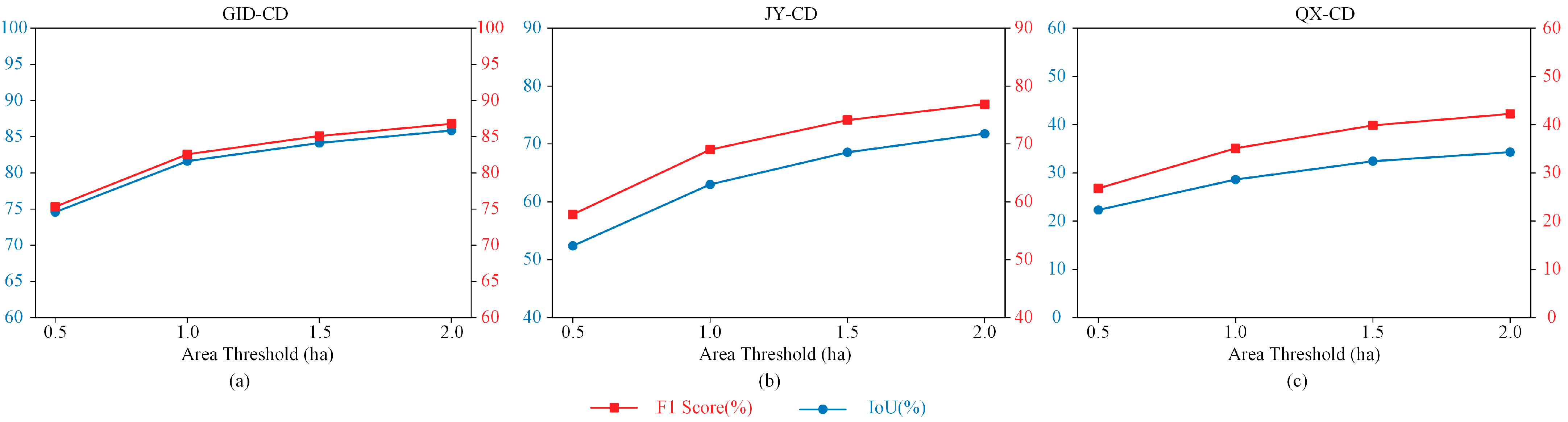 Figure 1), thereby ensuring that no spatial overlap occurred between the training/validation regions and the test regions. Within the training and validation regions, a sliding-window approach with a 50% overlap and a patch size of 256 × 256 pixels was applied to generate a sufficient number of samples. Ultimately, 17,364 and 26,704 training sample blocks were obtained for JY-CD and QX-CD, and 1780 and 2659 validation sample blocks, respectively.