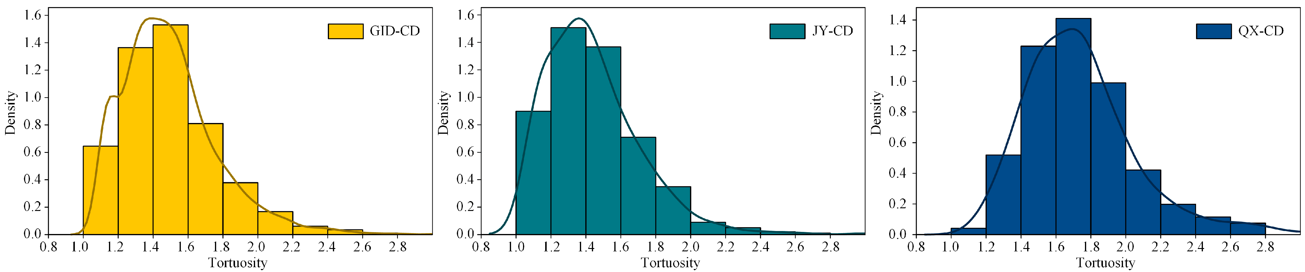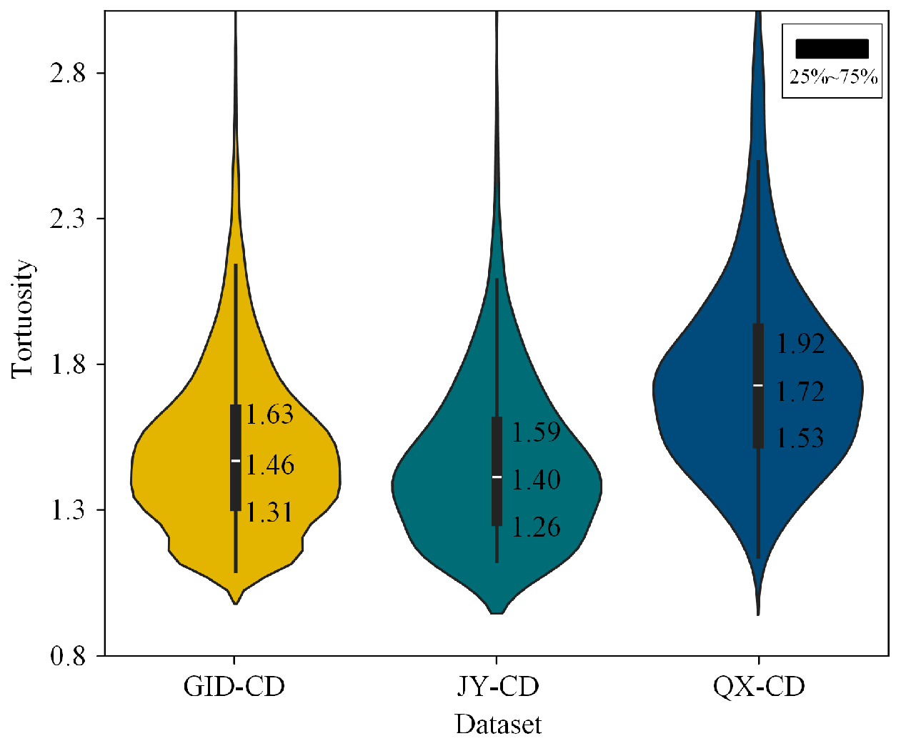 Figure 9 provides violin plots that further illustrate both the distribution and dispersion of tortuosity values. Compared to the other datasets, QX-CD exhibits not only a higher median tortuosity but also a greater upper quartile and a wider overall range. This quantitatively confirms that QX-CD has the highest boundary complexity in terms of geometric morphology among the three datasets.
