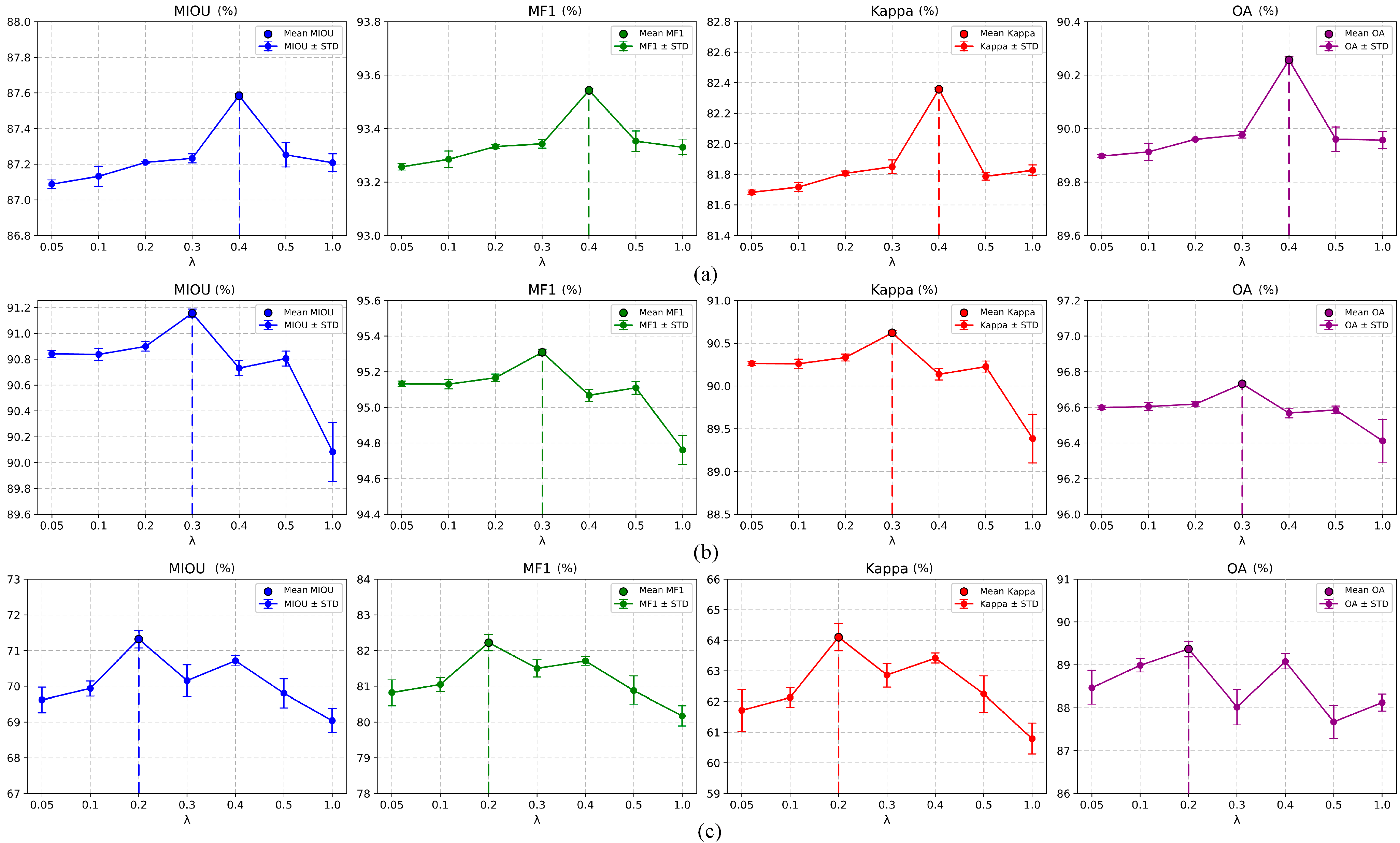 To investigate the influence of different λ values on model performance, each λ experiment was independently repeated three times, and the mean and standard deviation of MIoU, MF1, Kappa, and OA were reported.