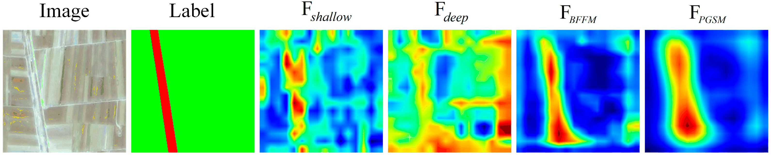 deep), the feature representations become more semantically enriched, revealing clearer object contours and structural patterns. The fused feature map from the BFFM (F