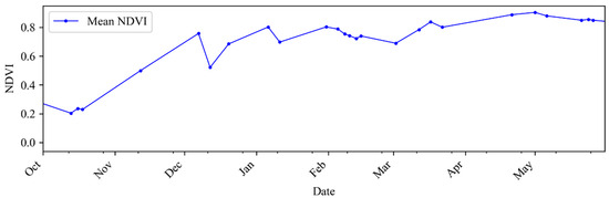 Figure 2. Temporal dynamics of NDVI values (Sentinel-2) within the study area from October 2022 to May 2023.