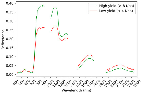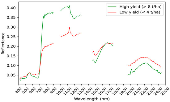 Figure 6. Spectral signatures of high- and low-yield winter wheat EnMAP pixels in May.
