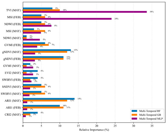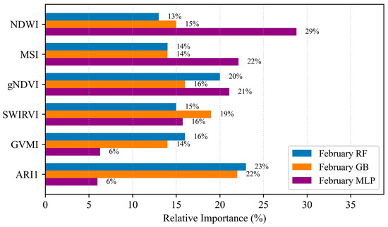 In the February acquisition, early-season indicators differed in terms of their contribution to model performance. While the forest-based models (RF and GB) emphasized the importance of VIS indices, particularly the ARI1 and gNDVI, the MLP model placed greater importance on SWIR-based indices, such as the NDWI and MSI. Among these, Random Forest (RF) provided the best performance, with an R2 of 0.62 and an MAE of 0.34. However, the MLP model also performed competitively, suggesting that both models were able to capture early crop vigor and moisture conditions, which are critical for estimating yield potential during the early growth phases.