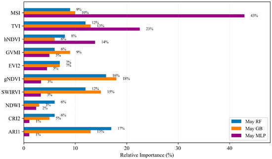 For the May acquisition, corresponding to the heading and flowering stages, the models shifted their focus towards capturing peak biomass and photosynthetic activity. In this scenario, MLP slightly outperformed the other models, achieving an R2 of 0.69 and an MAE of 0.33, indicating its strong ability to integrate both VIS and SWIR indices for more accurate mid-season yield prediction. The MLP model primarily relied on the MSI and TVI indices, while the forest-based models still placed considerable weight on the ARI1, gNDVI, and SWIRVI.