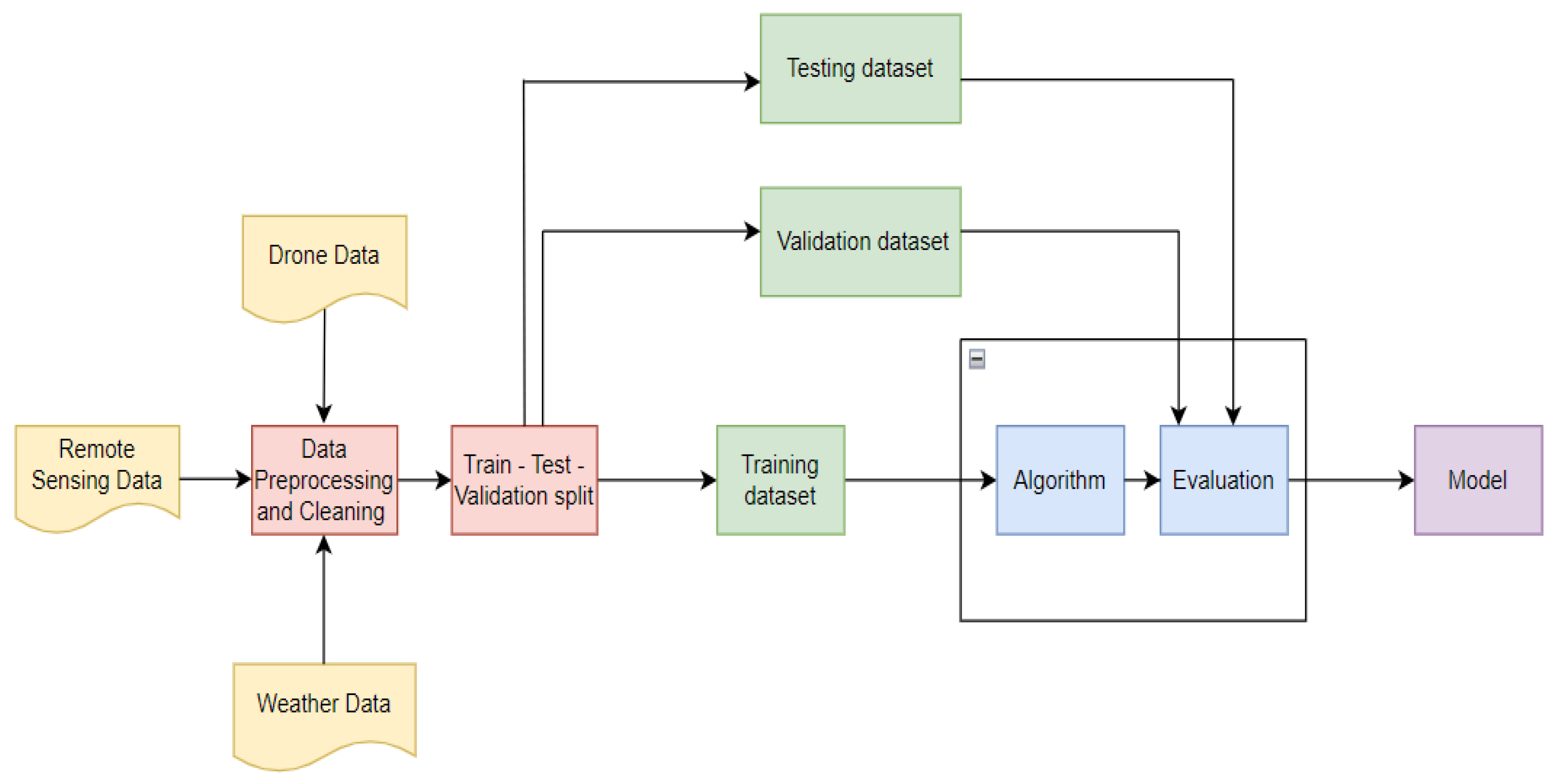 - UAV data and Vegetation indices from remote sensing data: NDVI, EVI, GCI, MSI, NDWI.