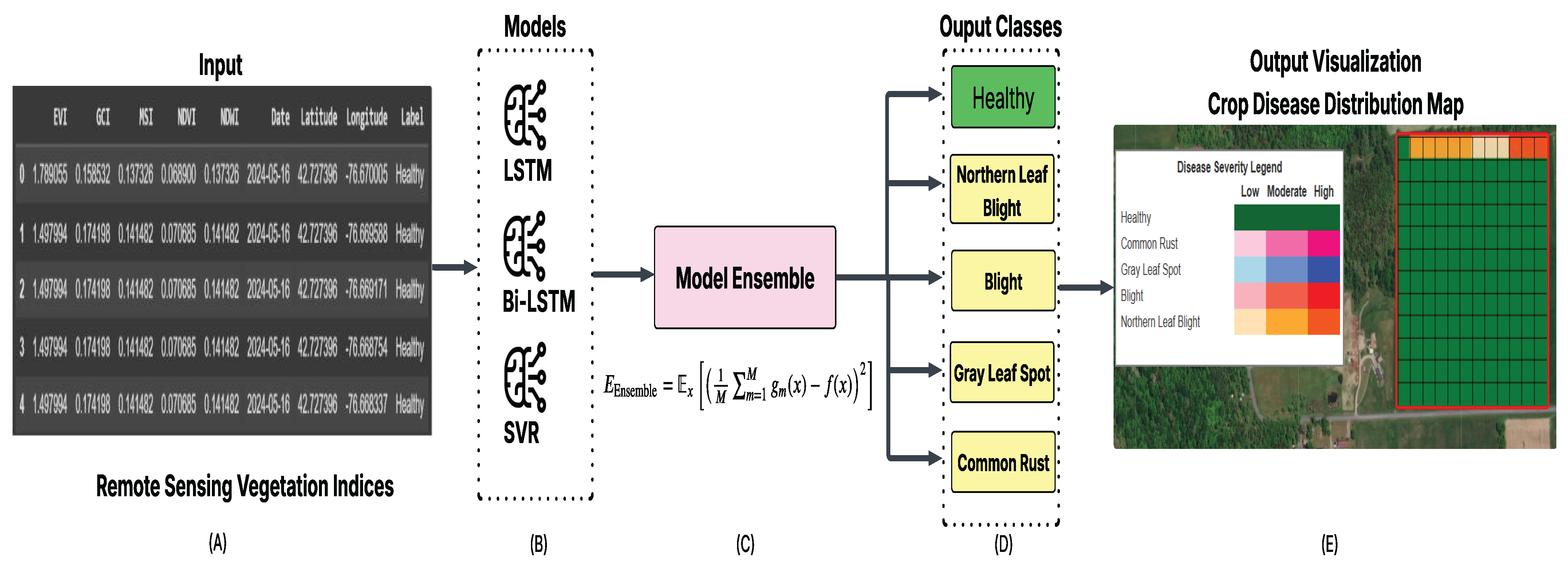 SVR | Remote Sensing Data | Maps vegetation indices to disease classes using kernel functions; effective for smaller datasets. | Common Rust—87.36%, NLB—78.32%, Blight—78.29%, Gray Leaf Spot—78.65%, Healthy—68.14% | Merits: Simple, low computation. Drawbacks: Limited on highly non-linear patterns. |