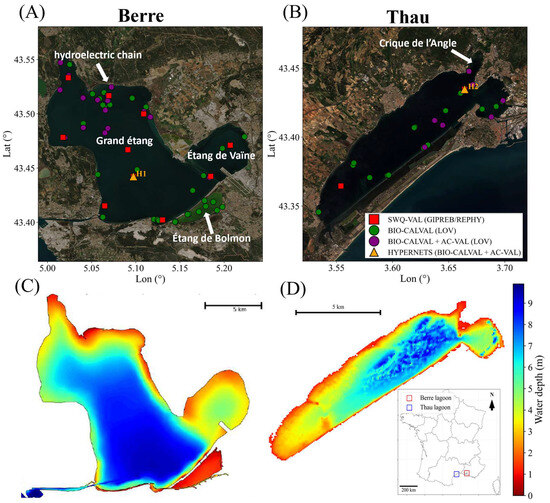 The Thau lagoon, near Montpellier, covers 68 km2 with an average depth of 4.5 m (max 10 m; Figure 1D). It exchanges water with the Mediterranean Sea through the Canals of Sète and the Grau de Pisses-Saumes. Circulation is wind-driven, with an average renewal time of 50 days. The lagoon is subject to a typical Mediterranean climate [9,10]. Its 269 km2 watershed combines natural areas, extensive vineyards, and urbanized zones. These heterogeneous catchments contribute to diffuse nitrogen (N) and phosphorus (P) inputs.