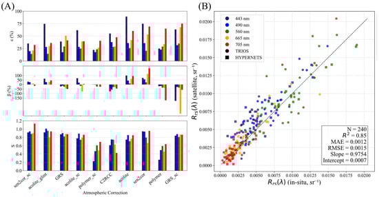Atmospheric correction (AC) performances of S2-MSI-derived Rrs in Berre and Thau lagoons: (A) ε, β, and S statistics associated with each AC, with and without applying the additional near-infrared similarity correction NIR-SC (denoted “_sc”). The statistics were computed based on observed differences between satellite-derived Rrs(λ) and in situ Rrs(λ) calculated from TRIOS (N = 29) and HYPERNETS (N = 21) measurements; (B) scatterplot and additional statistics concerning the Sen2Cor_sc AC.