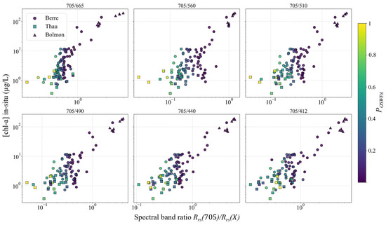 - Tran, M.D.; Vantrepotte, V.; Loisel, H.; Oliveira, E.N.; Tran, K.T.; Jorge, D.; Mériaux, X.; Paranhos, R. Band Ratios Combination for Estimating Chlorophyll-a from Sentinel-2 and Sentinel-3 in Coastal Waters. Remote Sens. 2023, 15, 1653. [Google Scholar] [CrossRef]