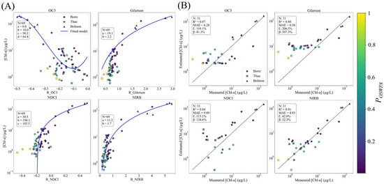 Validation metrics included those from Section 2.5, as well as the log–log slope (S) [39], the root mean square error (RMSE), the linear regression slope and the intercept for AC validation. A detailed summary of the AC-VAL, BIO-CAL/VAL, and SWQ-VAL datasets—including campaign dates, sites, number of stations, measured parameters, and sensors used—is provided in Supplementary Table S3.
