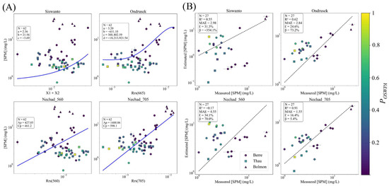 For [SPM], algorithms were selected based on the comparison made by [74] and the concentration range observed in the Berre, Thau and Bolmon lagoons (0–80 mg/L). Given this relatively narrow concentration range, we excluded switching-band models (e.g., [74,75]) and instead applied the Nechad [76] formulation at 560 and 705 nm. Table 2 summarizes the algorithms and their parameters.