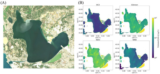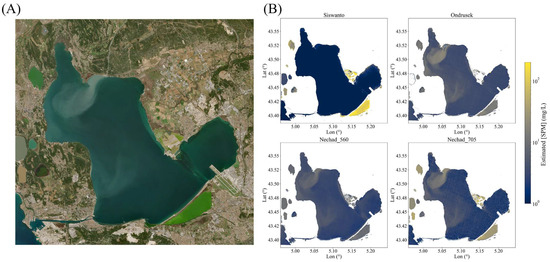 Monitoring lagoon water quality (WQ) is essential to anticipate, mitigate, and manage such events. Within the framework of the European Union Water Framework Directive (WFD), member states are required to ensure the “good ecological and chemical status” of all surface water bodies, including lagoons. This assessment relies on several parameters, notably the concentrations of chlorophyll-a ([chl-a])—a proxy for phytoplankton biomass—and suspended particulate matter ([SPM]) [11,12,13]. Both parameters strongly affect water transparency, another key parameter under the WFD.