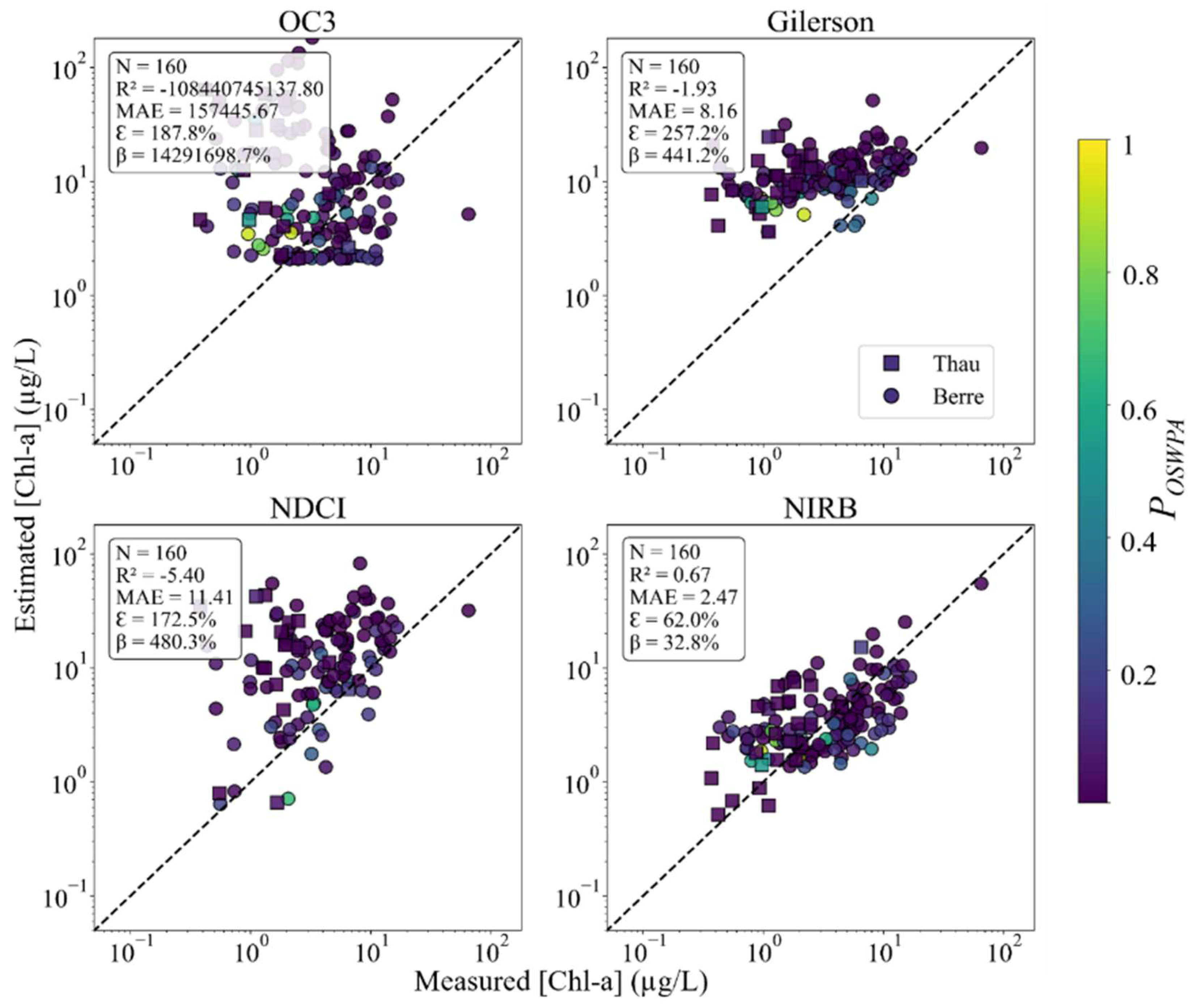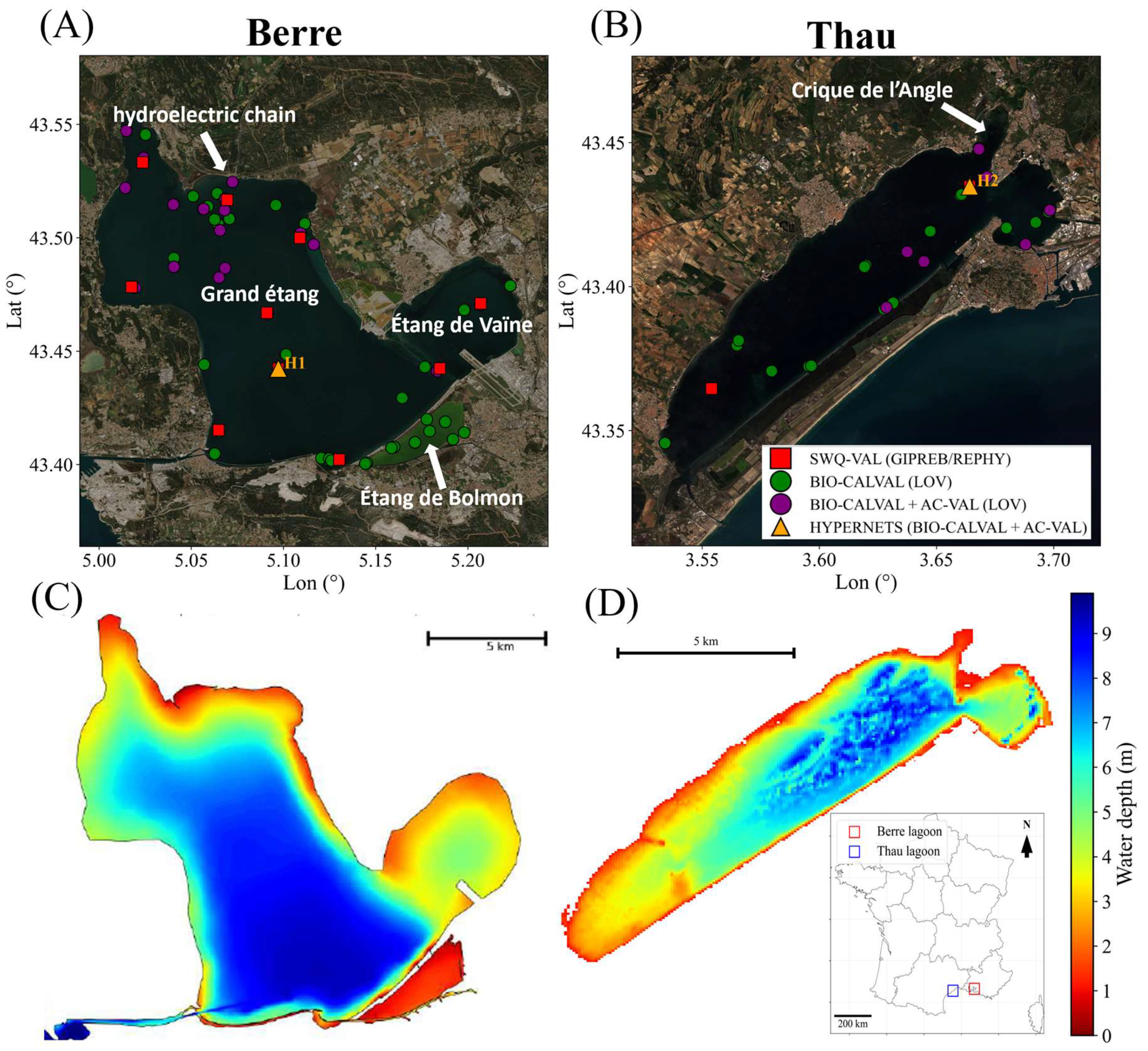- Satellite-derived Water Quality Validation (SWQ-VAL): based on independent GIPREB and REPHY data. For [chl-a], 160 matchups were obtained (129 in Berre, 31 in Thau; 0.3–68 µg.L−1). No [chl-a] data was available for Bolmon. For [SPM], 129 matchups (0.6–19.8 mg.L−1) were collected in Berre only, as REPHY does not monitor [SPM] in Thau. SWQ-VAL was used to validate satellite-derived [chl-a] and [SPM].