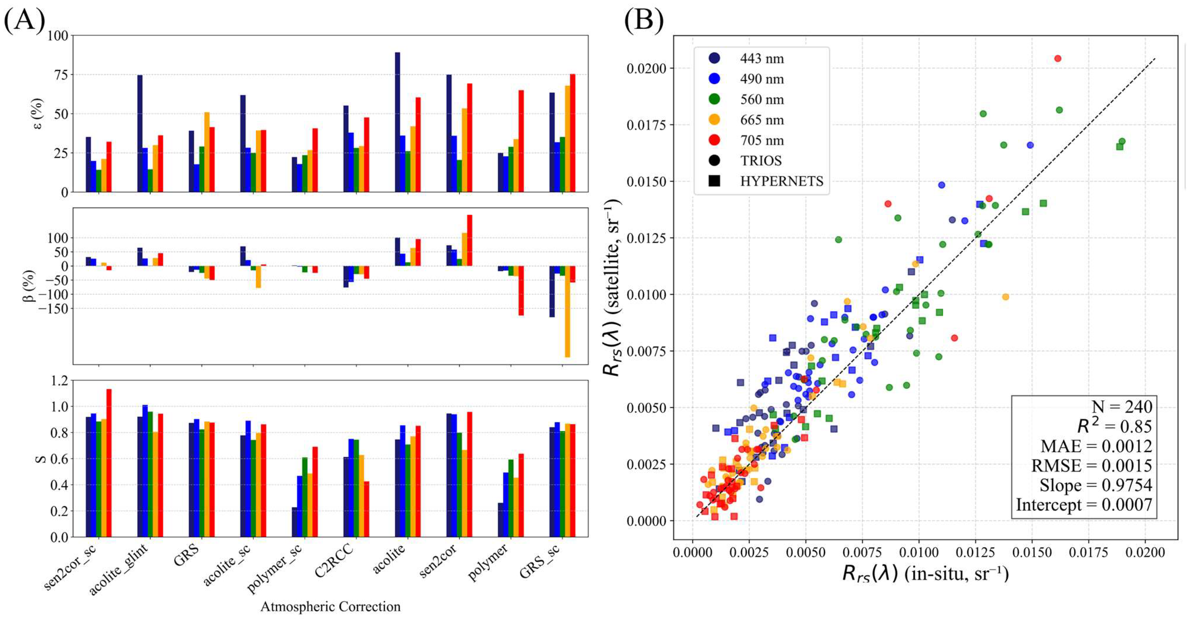 - Atmospheric Correction Validation (AC-VAL): 50 matchups with TRIOS and HYPERNETS Rrs data across Berre and Thau (Figure 1) were used to assess AC performance.