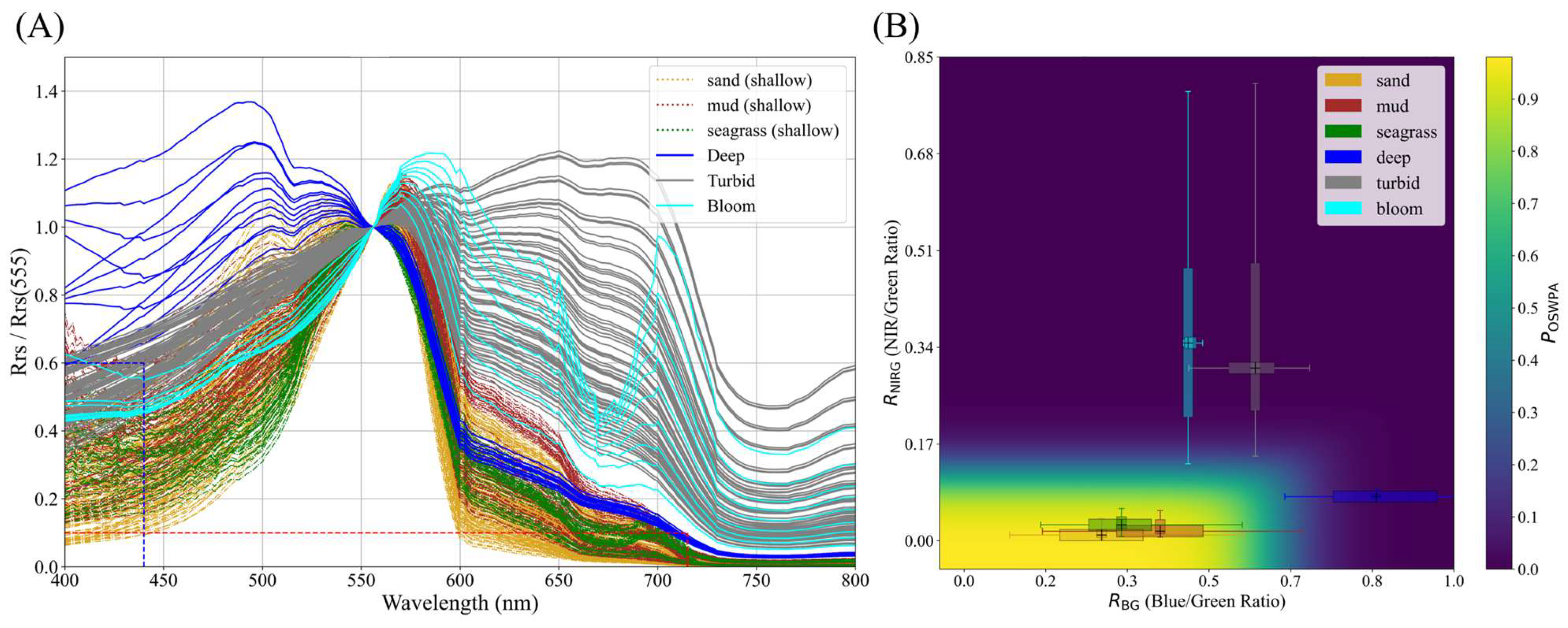 - Lee, C.B.; Traganos, D.; Reinartz, P. A Simple Cloud-Native Spectral Transformation Method to Disentangle Optically Shallow and DeepWaters in Sentinel-2 Images. Remote Sens. 2022, 14, 590. [Google Scholar] [CrossRef]
