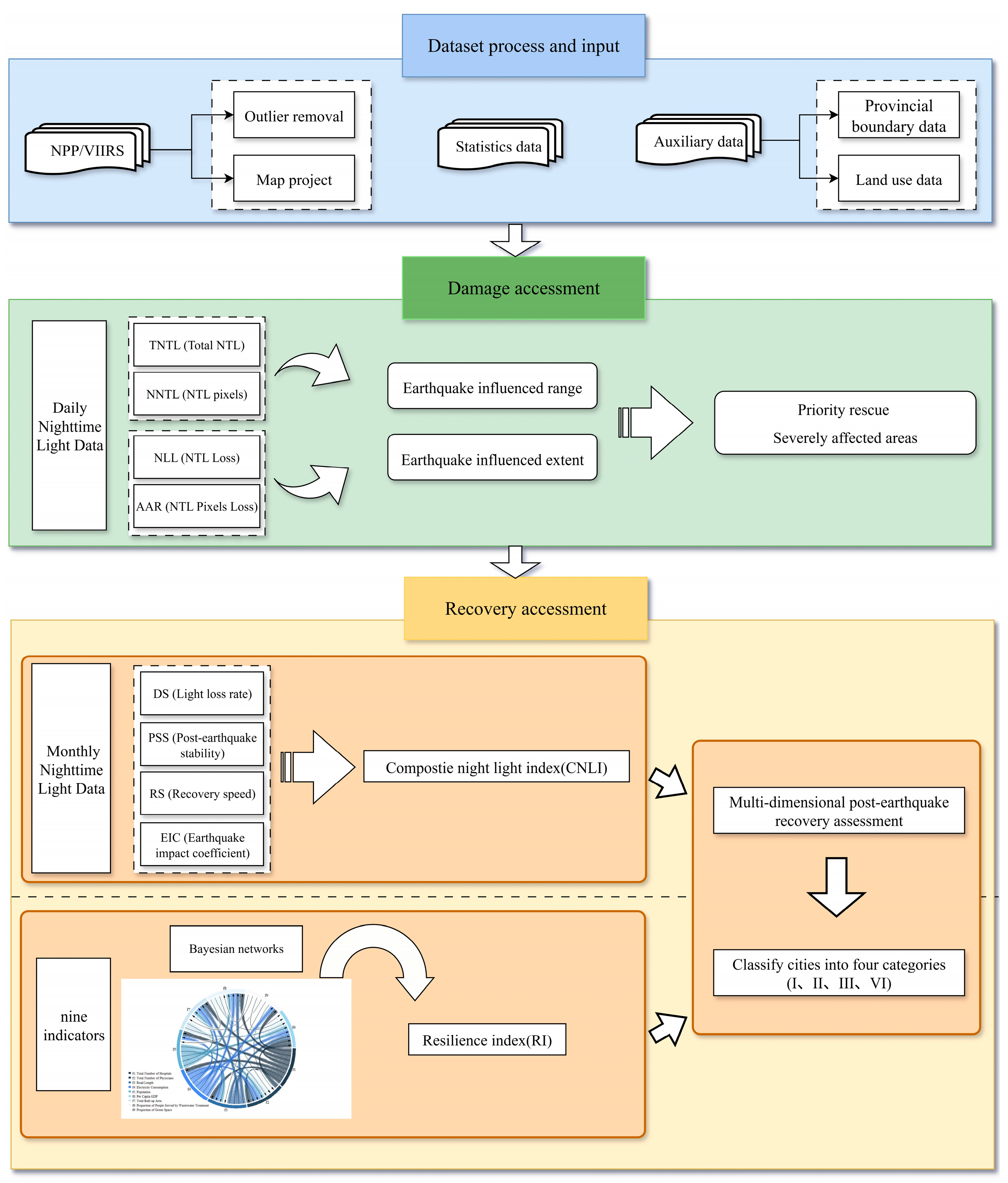 - Recovery assessment: This work proposes the Composite Nighttime Light Index (CNLI) to capture recovery dynamics, and develops a Resilience Index (RI) weighted by information gain derived from a Bayesian network to capture resilience levels.
