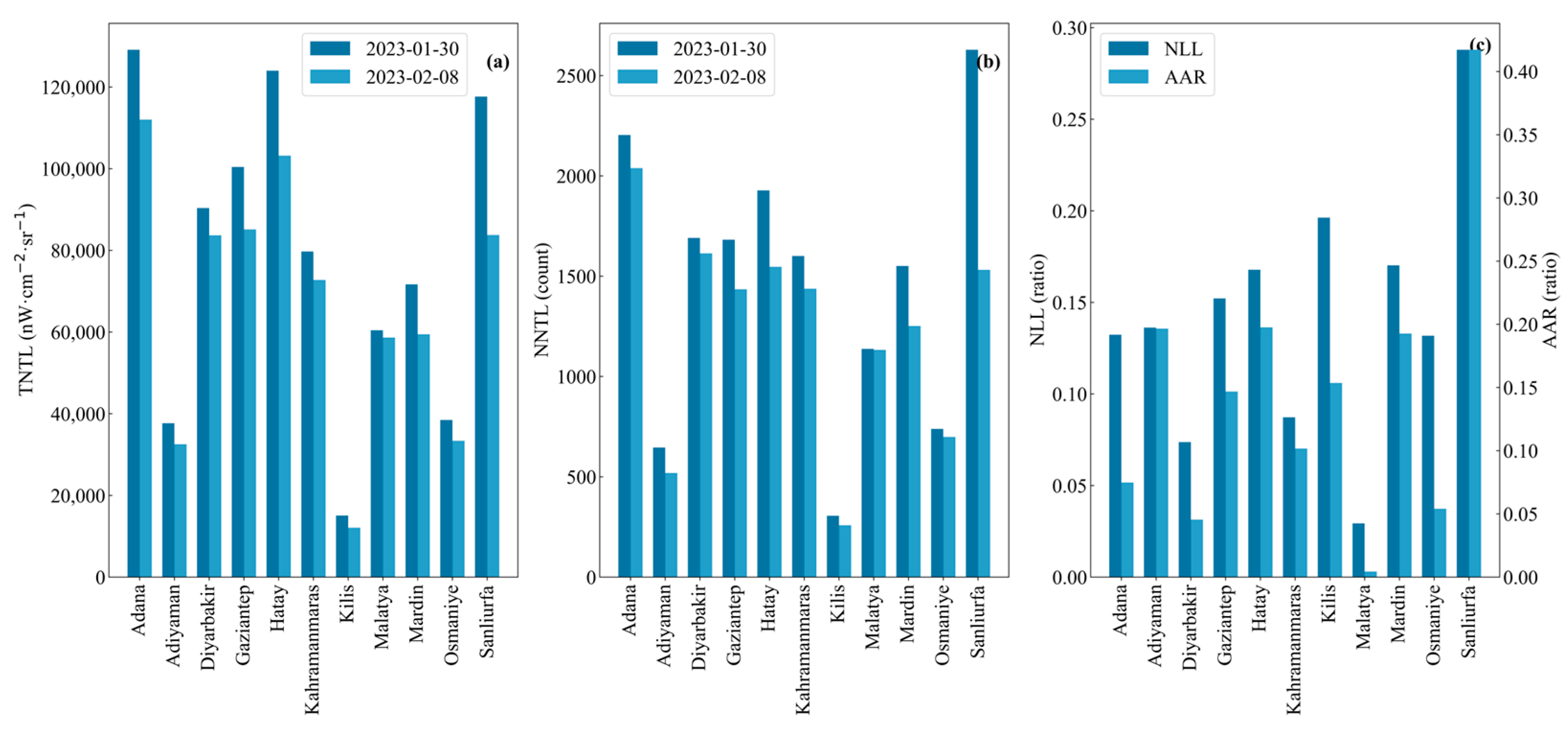 - Yuan, Y.; Wang, C.; Liu, S.; Chen, Z.; Ma, X.; Li, W.; Zhang, L.; Yu, B. The changes in nighttime lights caused by the Turkey–Syria earthquake using NOAA-20 VIIRS day/night band data. Remote Sens. 2023, 15, 3438. [Google Scholar] [CrossRef]
