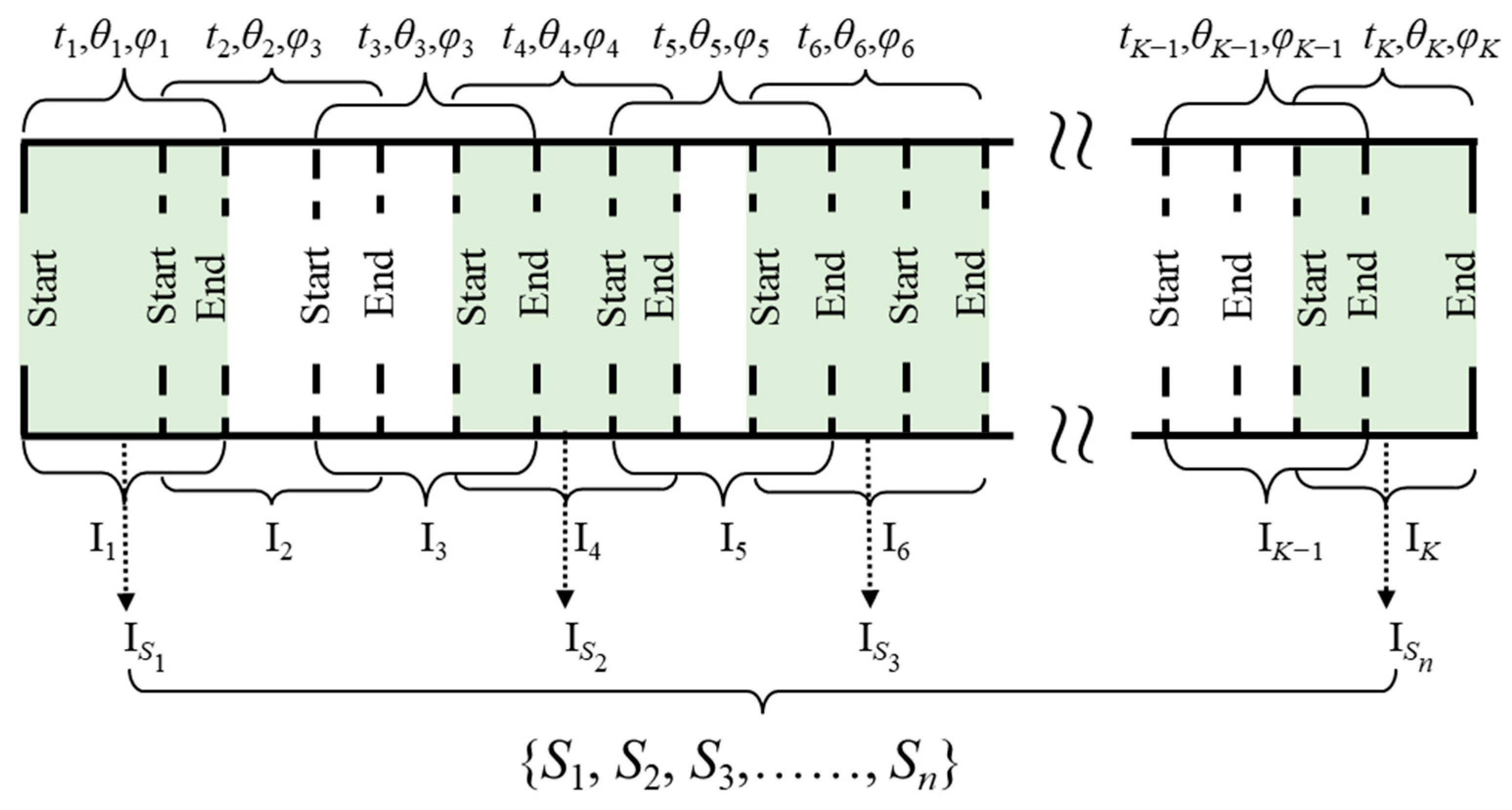 - Parameter initialization: The initial state of each particle in the swarm is established, encompassing both position and velocity. The position of each particle corresponds to a set of attitude angle parameters. Specifically, for the n-th particle, the initial candidate attitude parameter vector is denoted as . Meanwhile, the initial velocity represents the optimization direction of the particle’s parameters.
