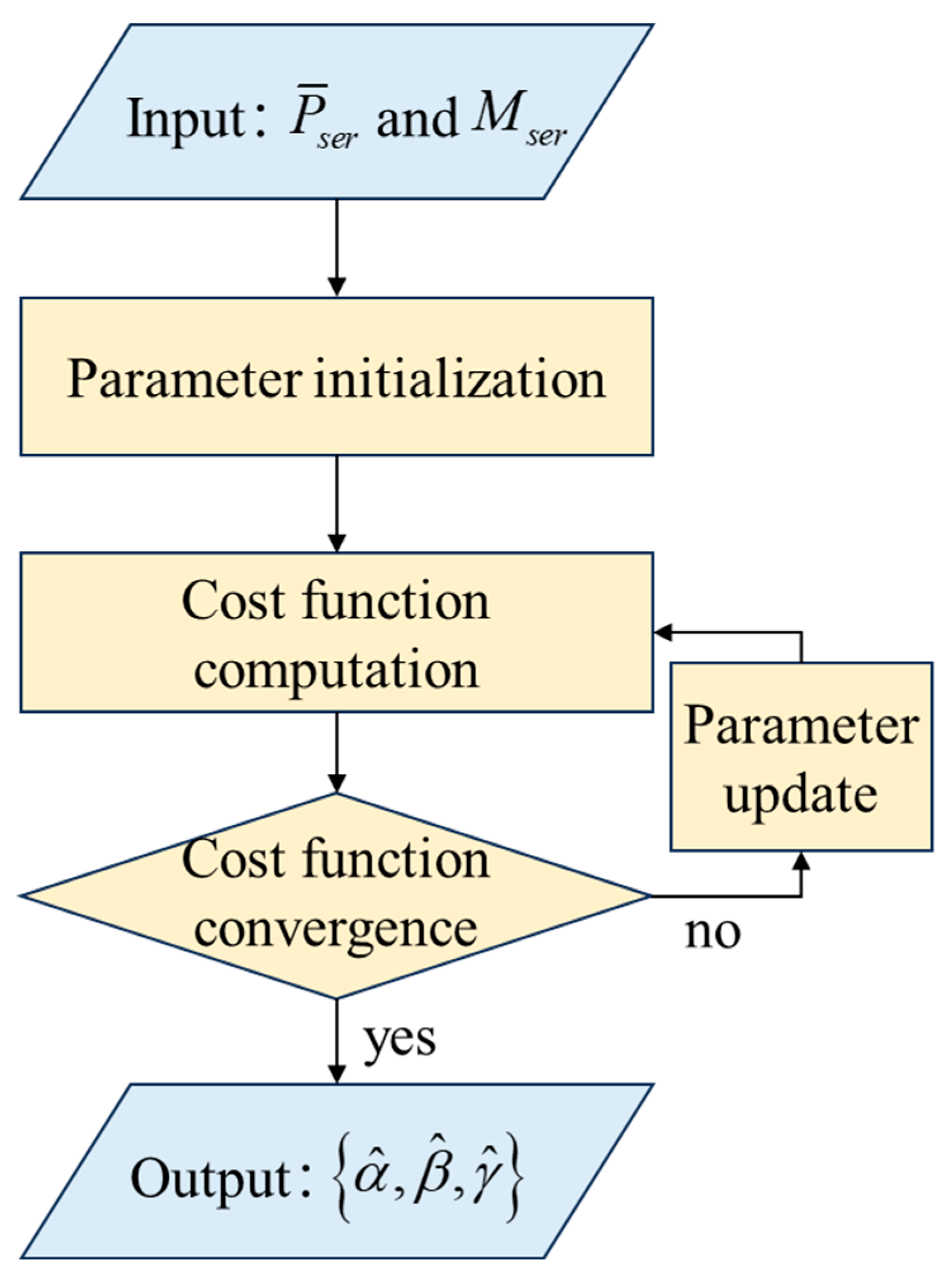- Iteration termination judgment: If no longer decreases, the iteration is terminated, and the parameters stored by are output. If , proceed to step (4);