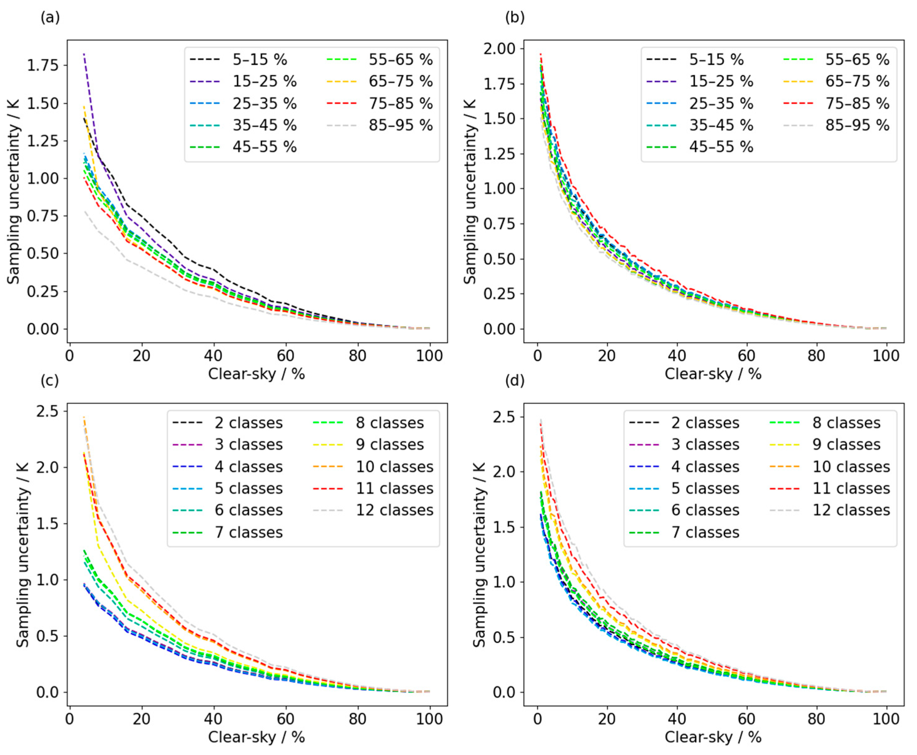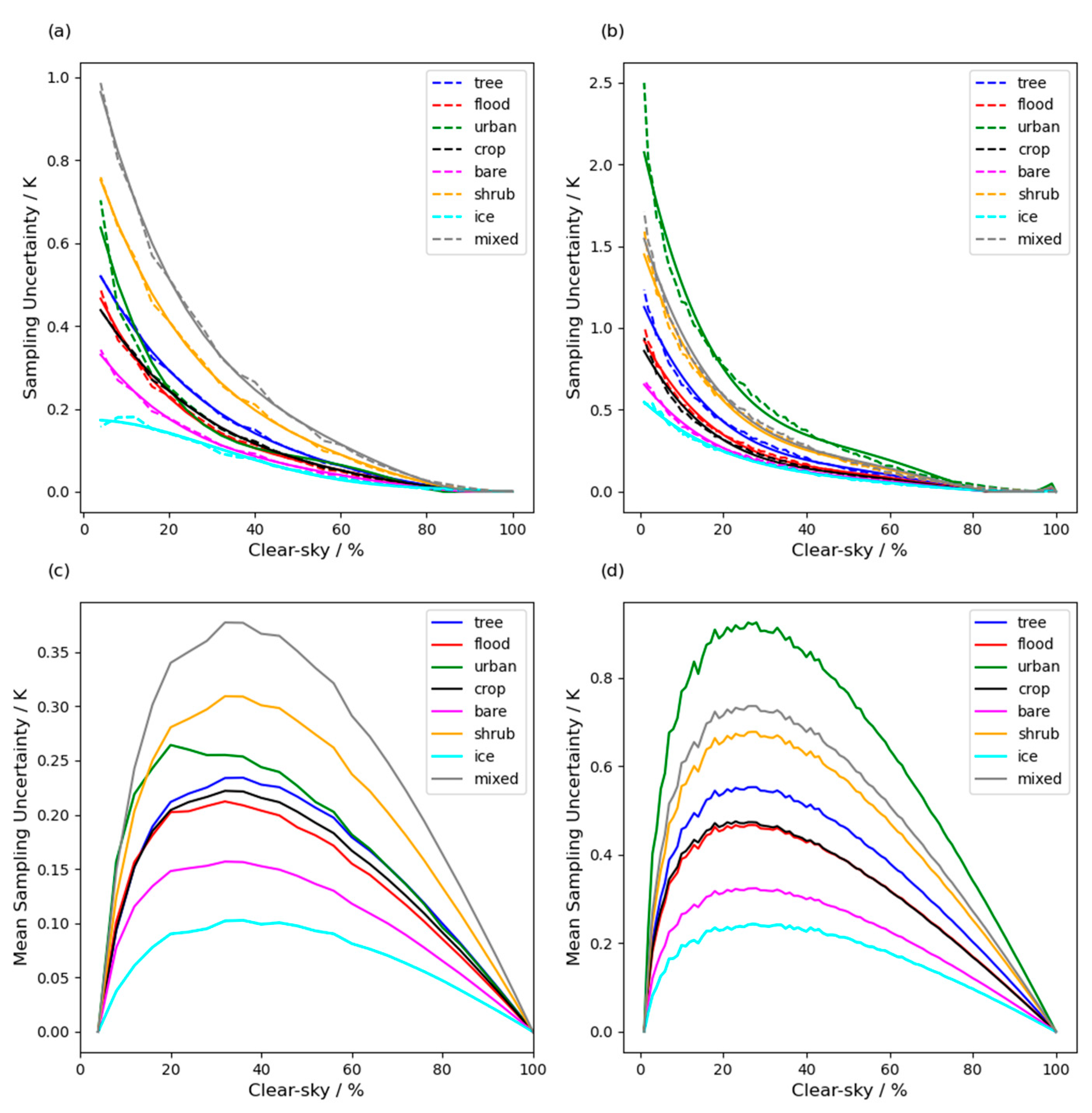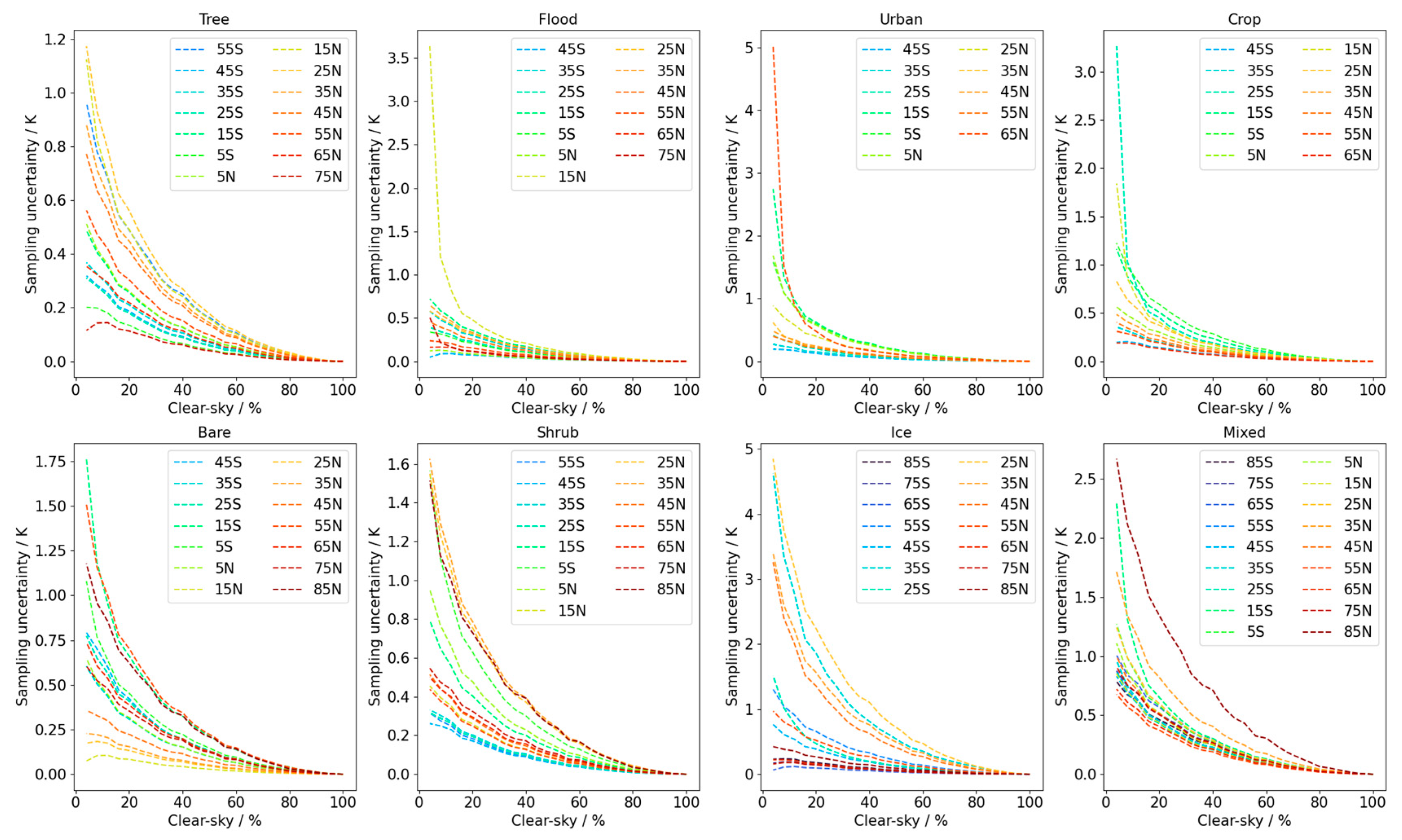 - The largest sampling uncertainties occur in regions of mixed land cover at 0.05° and for urban areas at 0.1° and the shape of the spatial sampling uncertainty curve with clear-sky fraction differs from previous parameterisations.