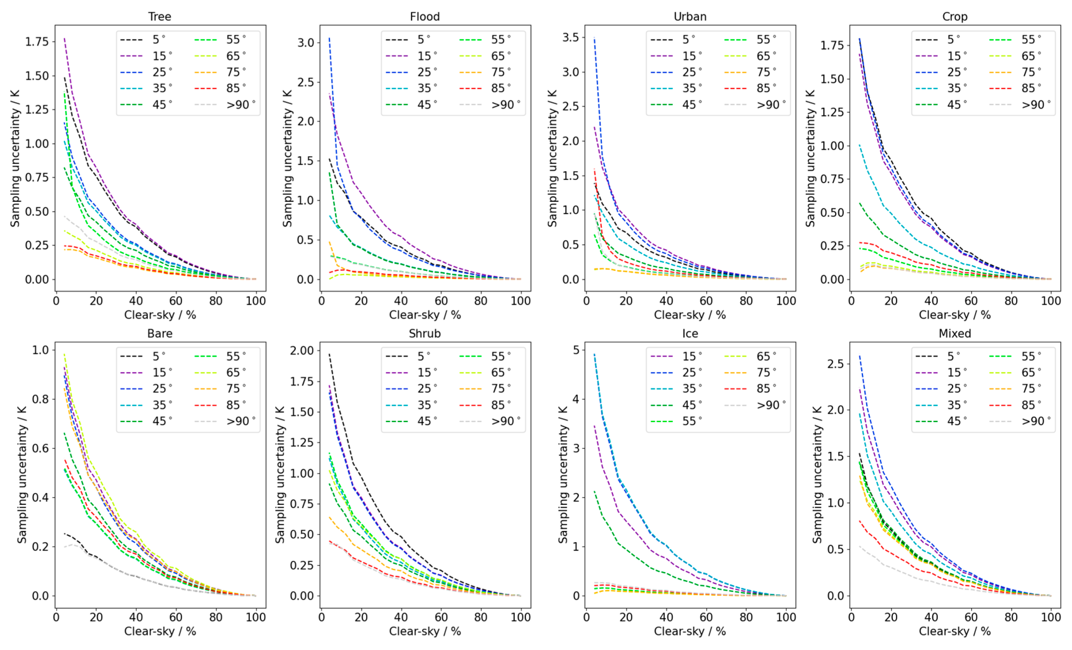 - Sampling uncertainty for land surface temperature is dependent on both the underlying land cover and the solar zenith angle at the time of observation.
