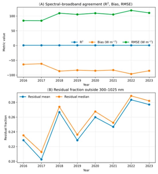 Figure 1 illustrates the interannual evolution of agreement metrics. Panel A highlights the consistently high R2 values, together with systematic negative biases and RMSE values within 84–119 W·m−2. Panel B shows the residual fraction (fresidual), which varied between 0.20 and 0.28, with higher values after 2018, consistent with the unmeasured spectral range beyond 1025 nm.