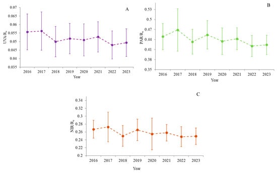 Annual means and standard deviations of spectral ratios for UVA/Rs (A), PAR/Rs (B), and NIR/Rs (C) components.