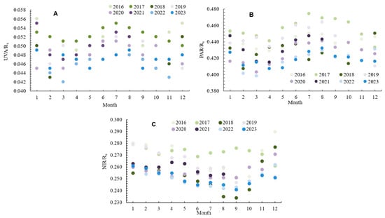 Monthly evolution of the spectral ratios for UVA/Rs (A), PAR/Rs (B), and NIR/Rs (C) for each year of the 2016–2023 period.