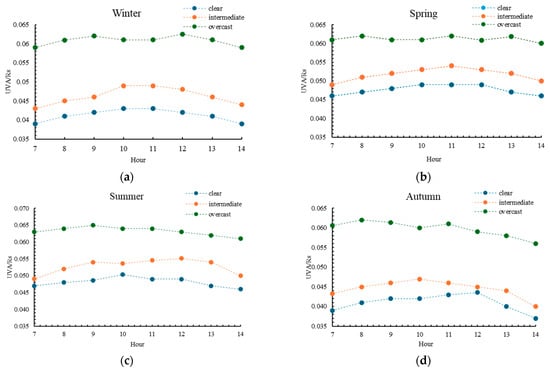 Diurnal variation in the UVA/Rs ratio under different sky conditions: (a) winter; (b) spring; (c) summer; (d) autumn. Each point represents the mean hourly value for the 2016–2023 period.