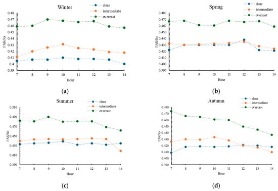 Diurnal variation in the PAR/Rs ratio under different sky conditions: (a) winter; (b) spring; (c) summer; (d) autumn. Each point represents the mean hourly value for the 2016–2023 period.