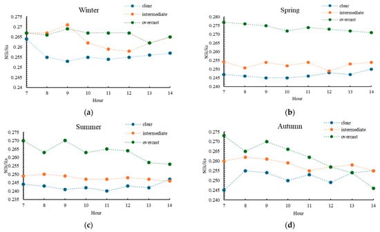 Diurnal variation in the NIR/Rs ratio under different sky conditions: (a) winter; (b) spring; (c) summer; (d) autumn. Each point represents the mean hourly value for the 2016–2023 period.