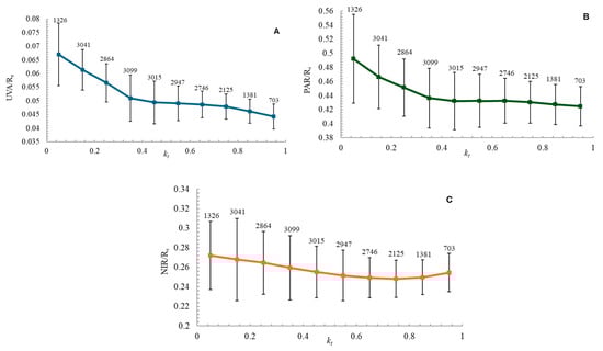 Variation in the spectral ratios with increasing clearness index (kt), where the numbers above the points indicate the number of data samples (n) included in each kt interval: (A) UVA/Rs ratio; (B) PAR/Rs ratio; (C) NIR/Rs ratio.