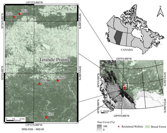 Reclaimed wellsite locations used for collecting RS and ground vegetation data within Alberta’s portion of the North American boreal zone [33]. Tree cover percentage is based on land cover data derived from MODIS imagery [34].