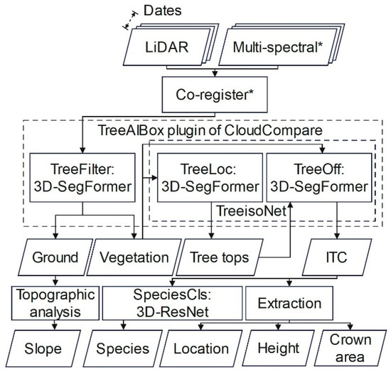 Workflow for individual-tree analysis from UAV-borne RS data using the TreeAIBox plugin. * The LiDAR dataset has been used as a reference to align the MS orthomosaic.