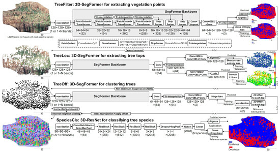 The UAV-based workflow for extracting vegetation statistics from reclaimed wellsites is illustrated in Figure 2. The process began with co-registration of a LiDAR point cloud and MS image using thin plate spline interpolation in QGIS. The resulting MS point cloud, stored in LAZ format, included five MS bands as additional attributes [38]. Four DL models were used (Figure 3): (1) TreeFilter: 3D-SegFormer for separating vegetation [43]; (2) TreeLoc: 3D-SegFormer producing 2D tree top locations, adapted from [44]; (3) TreeOff: 3D-SegFormer for individual tree segmentation, adapted from [44]; and (4) SpeciesCls: 3D-ResNet for classification of individual tree species as either coniferous or deciduous [45]. The first three models are implemented in the CloudCompare software v.2.14 as a graphical user interface plugin, TreeAIBox (https://github.com/NRCan/TreeAIBox (accessed on 1 October 2025)).