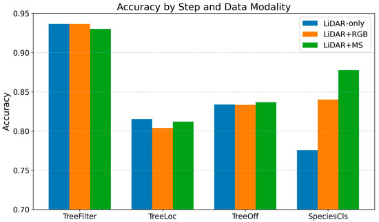 Model accuracies with LiDAR point cloud data only, LiDAR + RGB data, and LiDAR + MS (red, red edge, green, NIR, and blue) data.