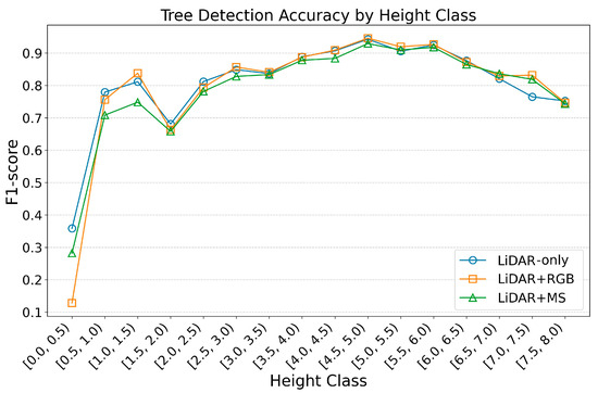Tree-detection F1-scores across height classes for the different datasets are shown in Figure 5. Detection accuracy does not improve for either short or tall trees when additional bands are included.