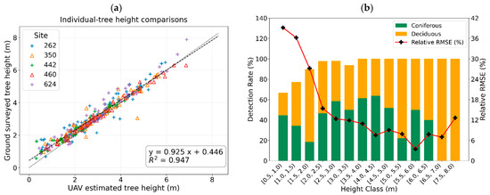 Accuracy assessment of individual-tree extraction from UAV-LiDAR against field measurements: (a) comparison of LiDAR-derived and ground-measured tree heights; and (b) detection rate (%) and relative RMSE (%) by height class (m), with coniferous (green) and deciduous (yellow) proportions.